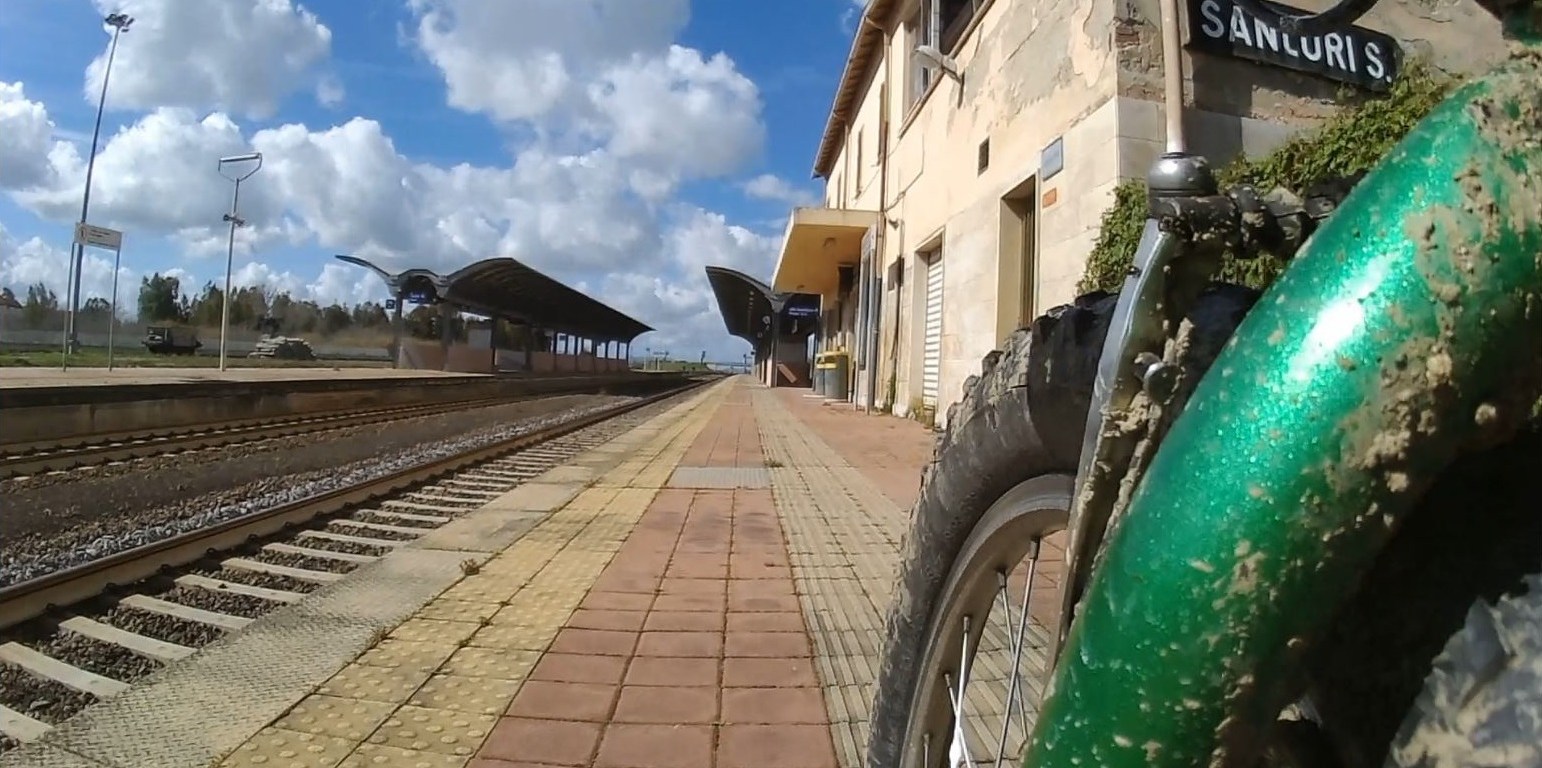 Giunti alla stazione di Villasor, abbiamo ripulito le bici dal fango, attirando la curiosità del solito pensionato che non si perde un cantiere manco morto (e siccome, essendo domenica mattina, eravamo l’unico “cantiere di lavoro” nel raggio di cinquanta chilometri, si è “goduto” il nostro scrostamento-bici fino alla fine).