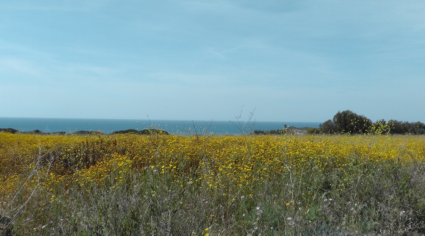 Questo tratto dell’itinerario è sicuramente il più affascinante. I campi fioriti giungono fino al mare, separati solo dalla striscia di sabbia, caratterizzando questo paesaggio fiabesco. Si pedala in perfetta solitudine, e gli unici rumori sono quelli delle bici e delle nostre chiacchiere.