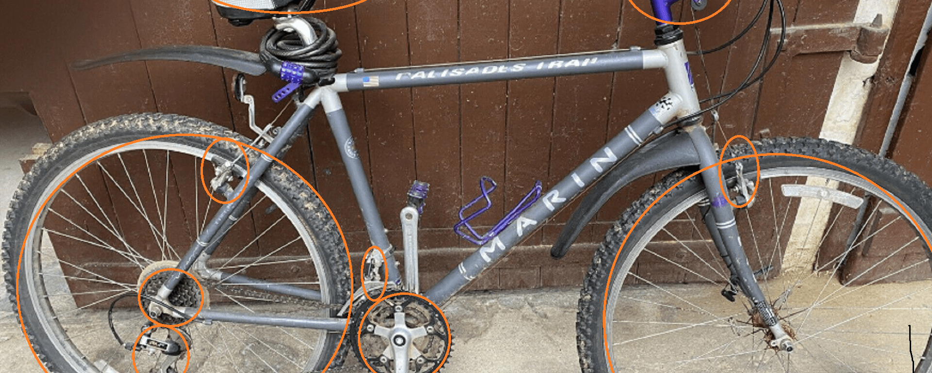 Per rendere la mtb attuale, l’abbiamo letteralmente spolpata di quasi tutti i suoi componenti (montava addirittura freni cantilever, ovvero archeologia ciclistica, oltre chiaramente a una trasmissione 3x7v), mantenendo giusto quel poco che è ancora al passo coi tempi e che comunque ne mantiene i tratti caratteristici (ovvero i pezzi originali Marin Lite di colore viola che si vedono in foto: manubrio, portaborraccia, pedali).