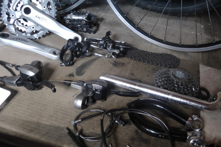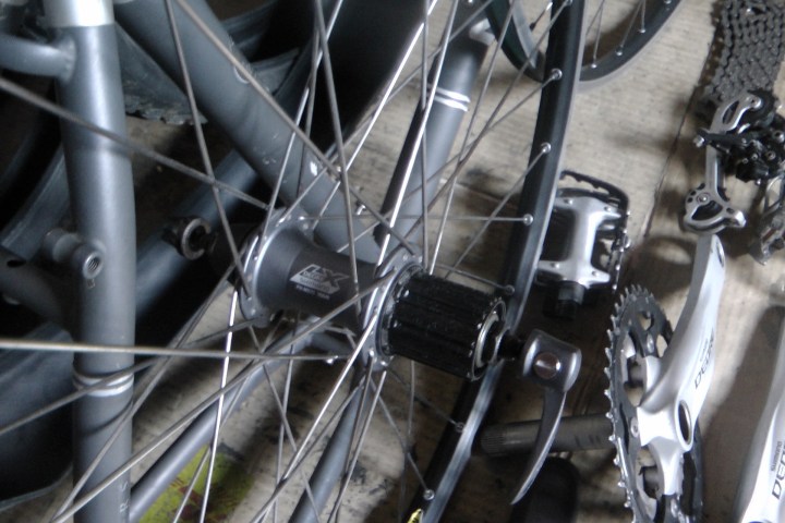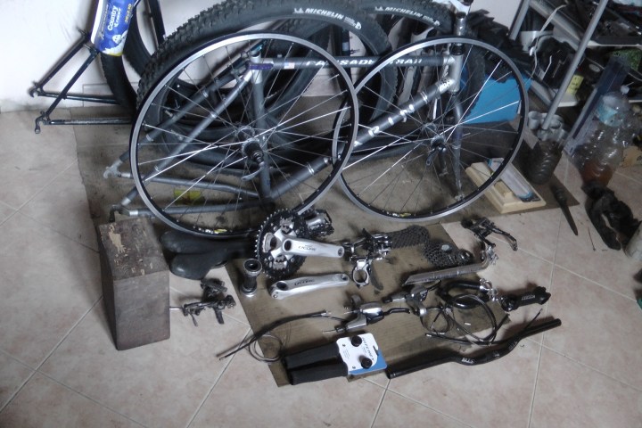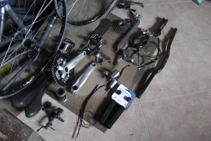 In questa fotografia d’insieme sono visibili tutti (ma proprio tutti) i componenti che, a breve, da questo “mucchietto” più o meno ordinato diventeranno un unico insieme (ovvero, una bicicletta).