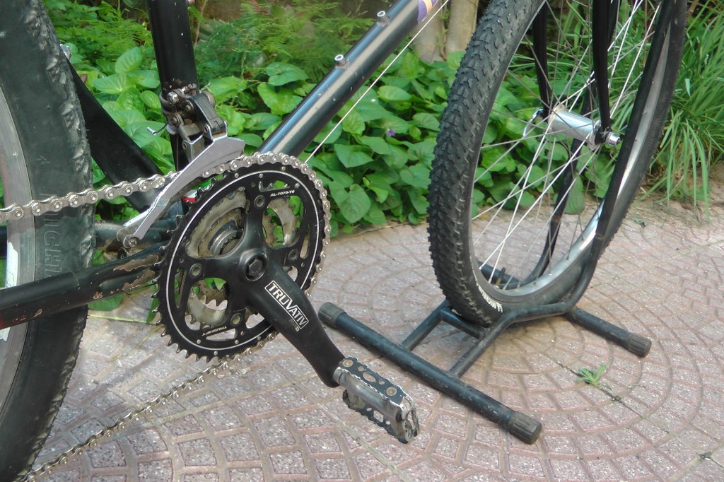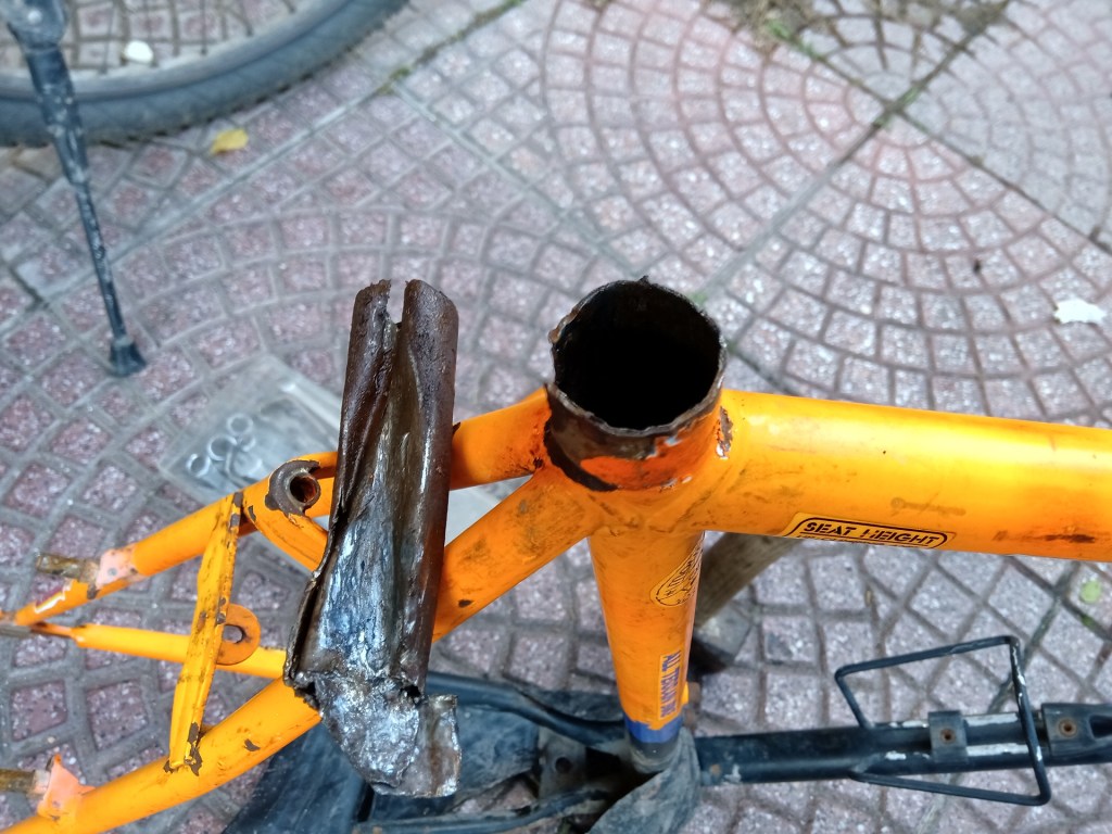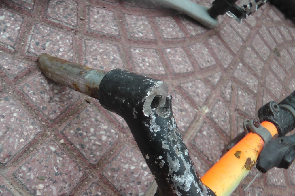 In queste prime immagini potete ammirare il rottam… ehm, la mountain bike, sottoposta all’estrazione di tubo sella, pipa e pedivelle. Per pipa e pedivelle si è andati di smeriglio, senza pietà (tanto i pezzi erano da buttare). Per il tubo sella invece si è operato effettuando dei tagli longitudinali all’interno del tubo, in modo che, battendo con una punta tra telaio e tubo, si riuscisse a distaccare pian piano le due parti (e i tagli longitudinali son serviti a far staccare il tubo a pezzi). E’ stato un lavoro lunghissimo, perché la punta, battuta col martello, poteva avanzare di pochi decimi ogni volta, altrimenti si sarebbe incastrata tra telaio e tubo.